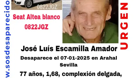 Arahal Buscan a un anciano de 77 años desaparecido desde el pasado martes en Arahal J.J. Sarabia RSS 08/ene/25 De 1,68 metros de estatura, complexión delgada, calvicie parcial y pelo canoso