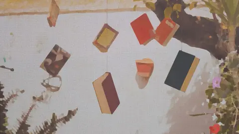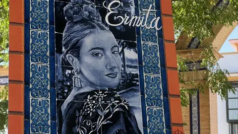 La obra mezcla óleo y técnicas digitales, y destaca el alicatado del arco de la Ermita como motivo central