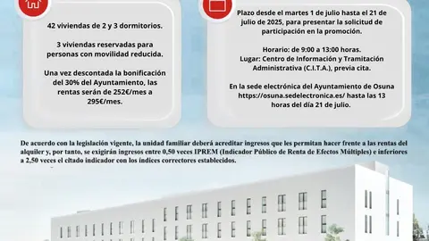 Osuna Osuna abre convocatoria para adjudicar 42 viviendas de alquiler en régimen especial Diario Avanza RSS 30/jun/25 La solicitud podrá presentarse hasta el 21 de julio en el C.I.T.A. o por sede electrónica