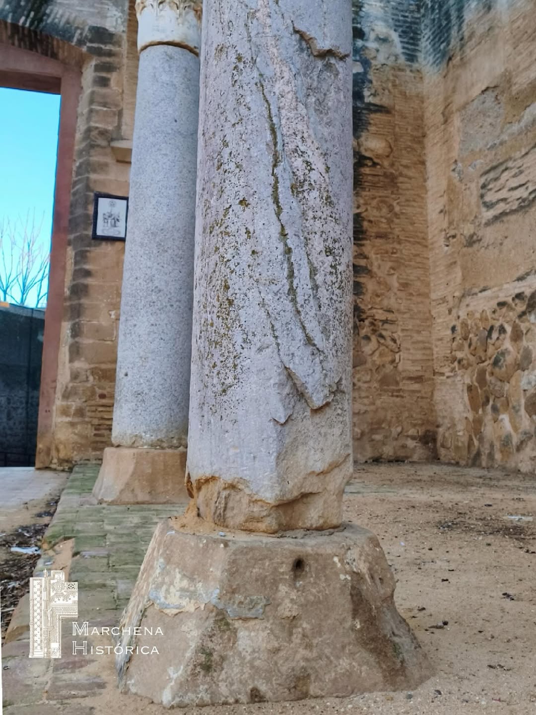 Las humedades, la verdina y el moho han invadido buena parte del pavimento. El mortero de las paredes está perdiendo cohesión, y, en consecuencia, se está desprendiendo, con la amenaza que supone para la solidez de la estructura. Por otro lado, los fustes y capiteles, algunos de ellos visigodos e incluso bajoimperiales, presentan fisuras y un avanzado estado de erosión, hasta el punto de que tememos no logren soportar el peso del abandono institucional, como le pasó al muro situado junto a la puerta de entrada al solar palaciego.