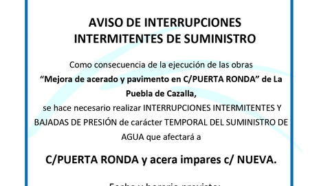 Interrupciones de agua en La Puebla de Cazalla por obras en la calle Puerta Ronda